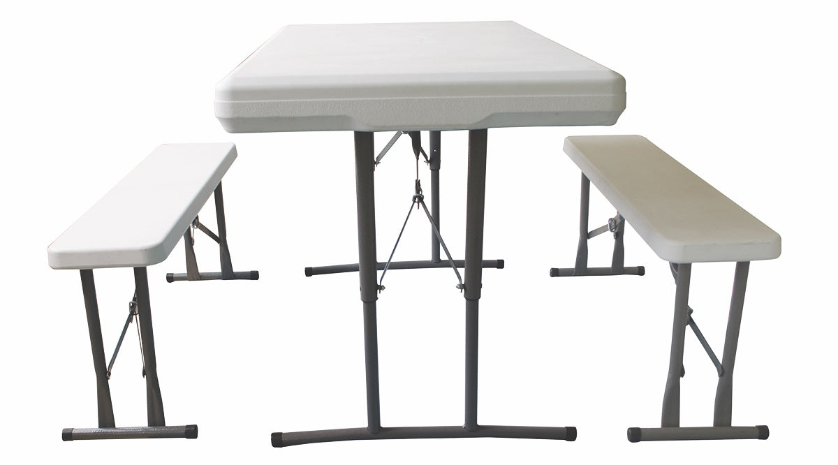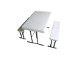 Mesa y bancas de una sola pieza de patas plegables, las bancas se guardan e incrustan por debajo de la mesa, fácil de transportar, para uso en jardín, llevar a un día de campo, para cafeterías móviles y fijas. Acomoda a 4 personas.