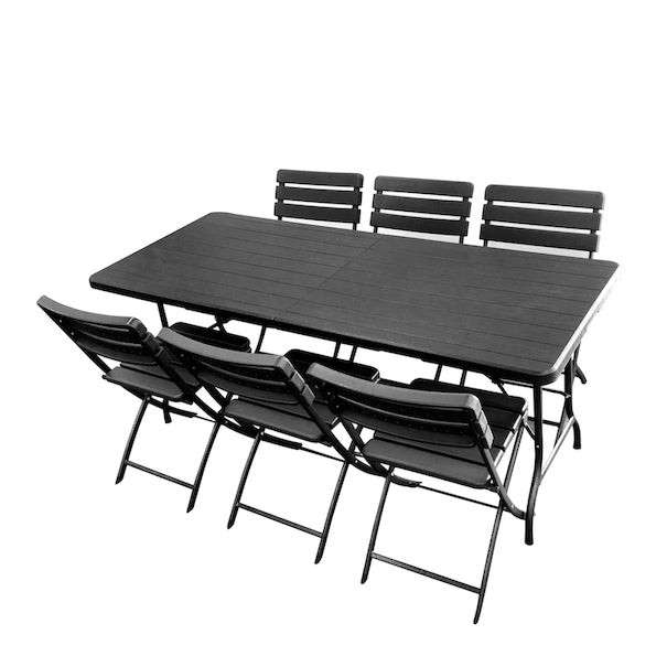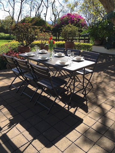 Una mesa plegable a la mitad y 6 sillas con un acabado natural amigable visualmente con el ambiente natural. Puedes usarlo en interiores o exteriores para uso domestico.