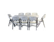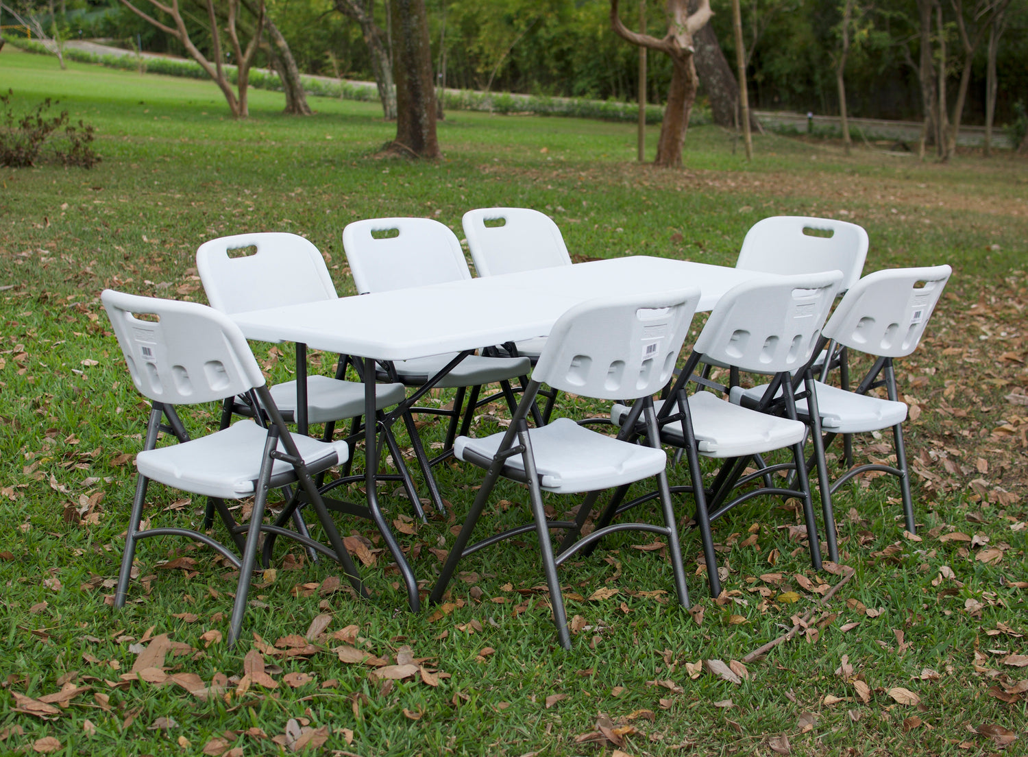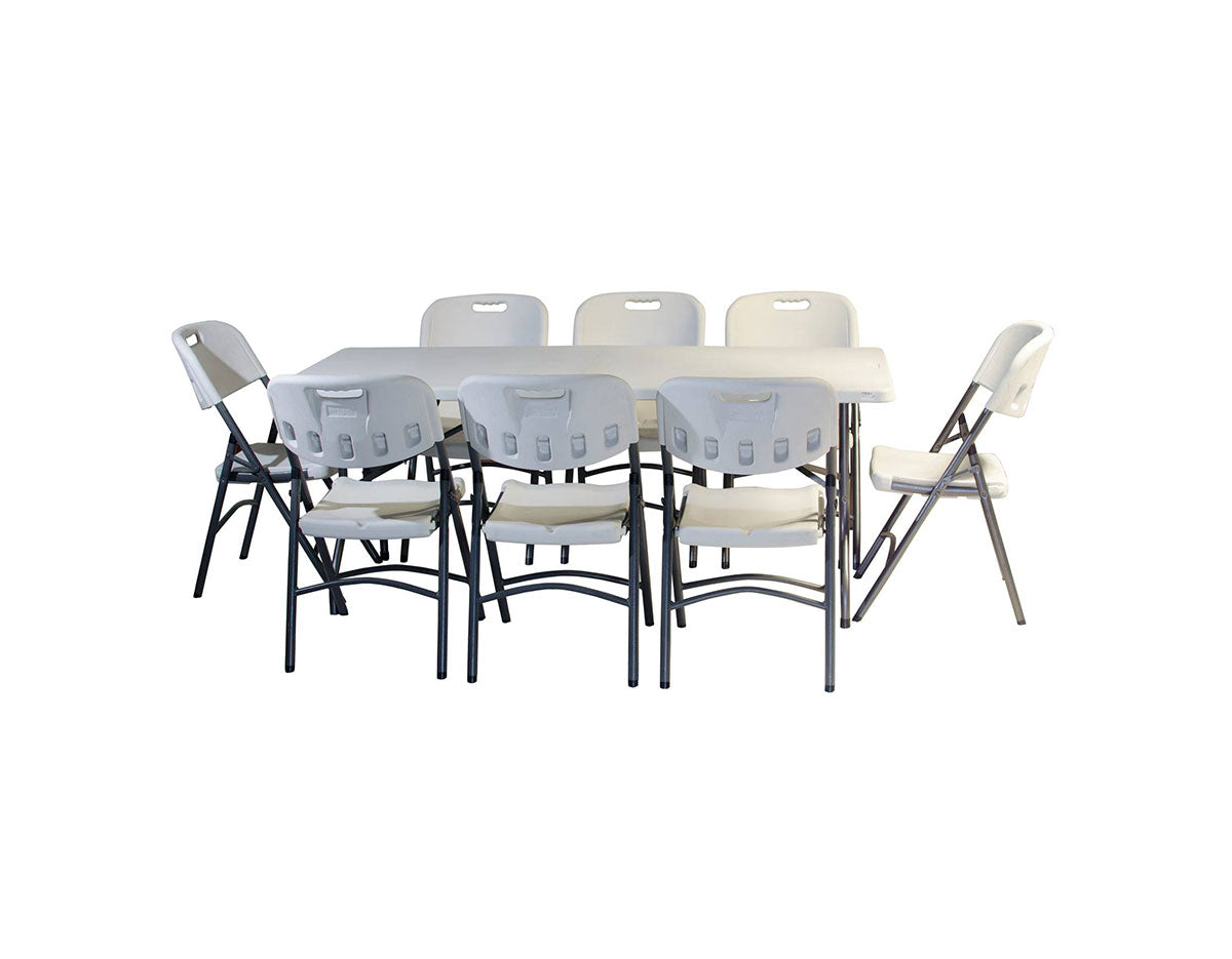 Una mesa plegable a la mitad y 8 sillas robustas.